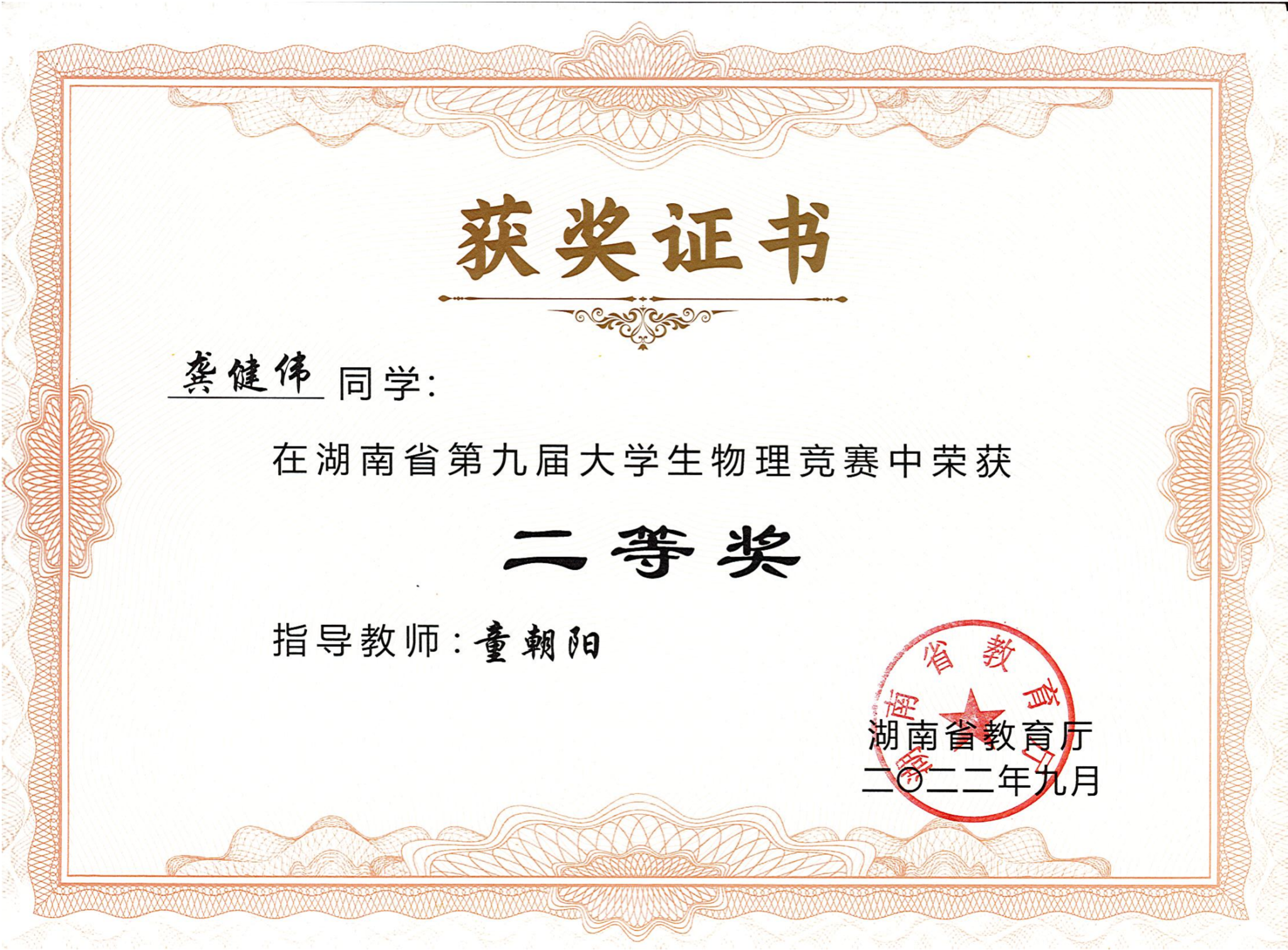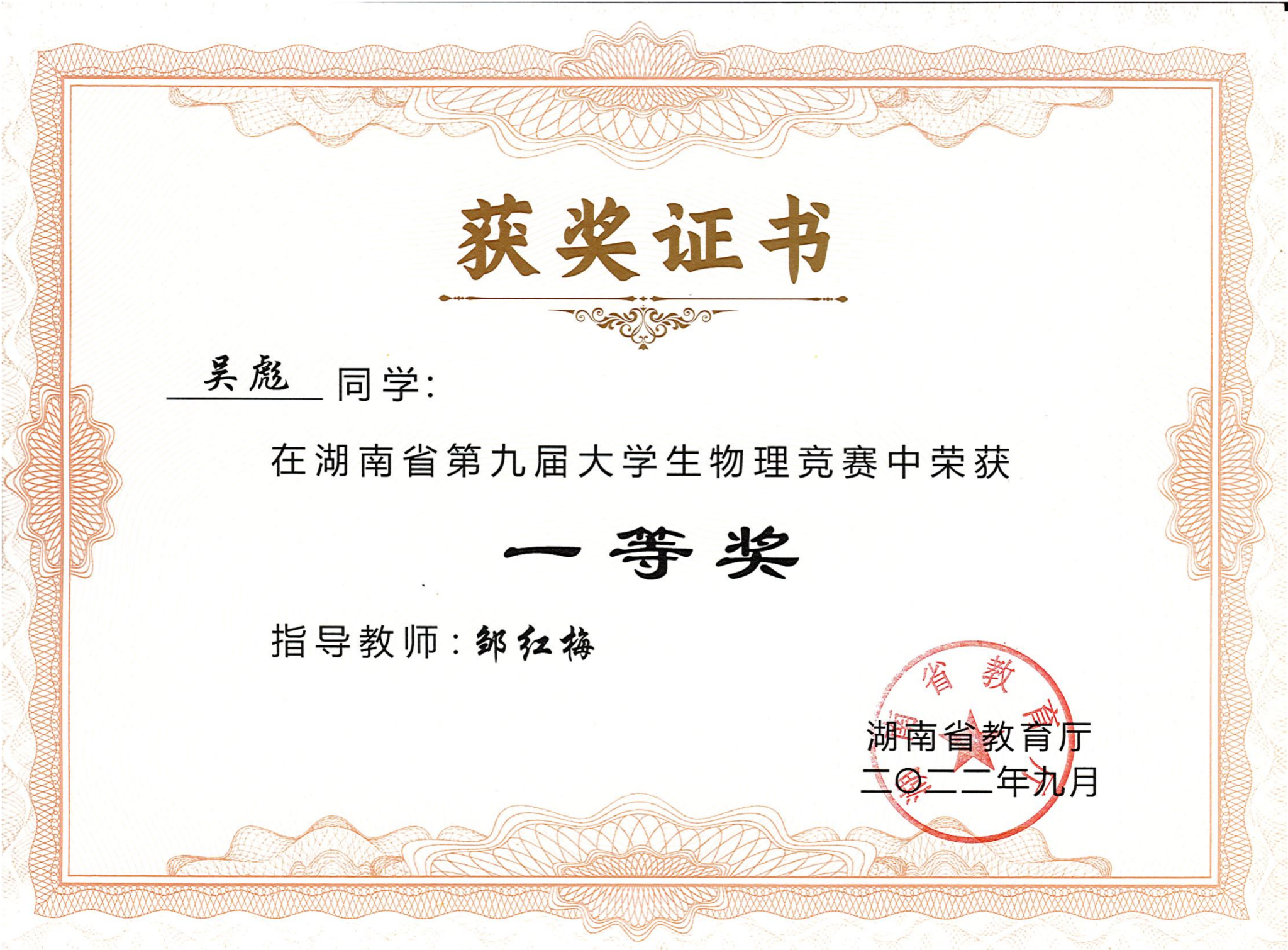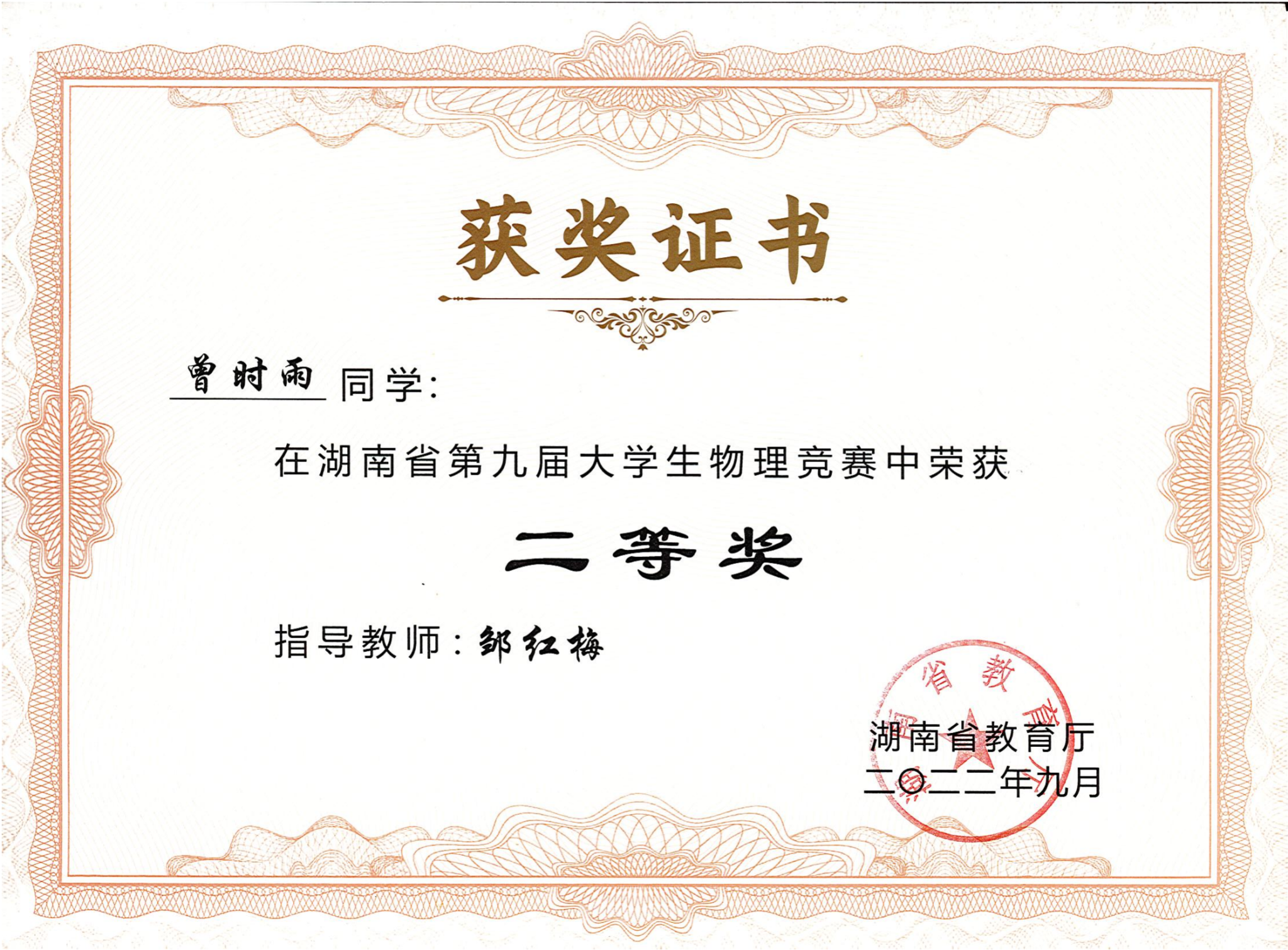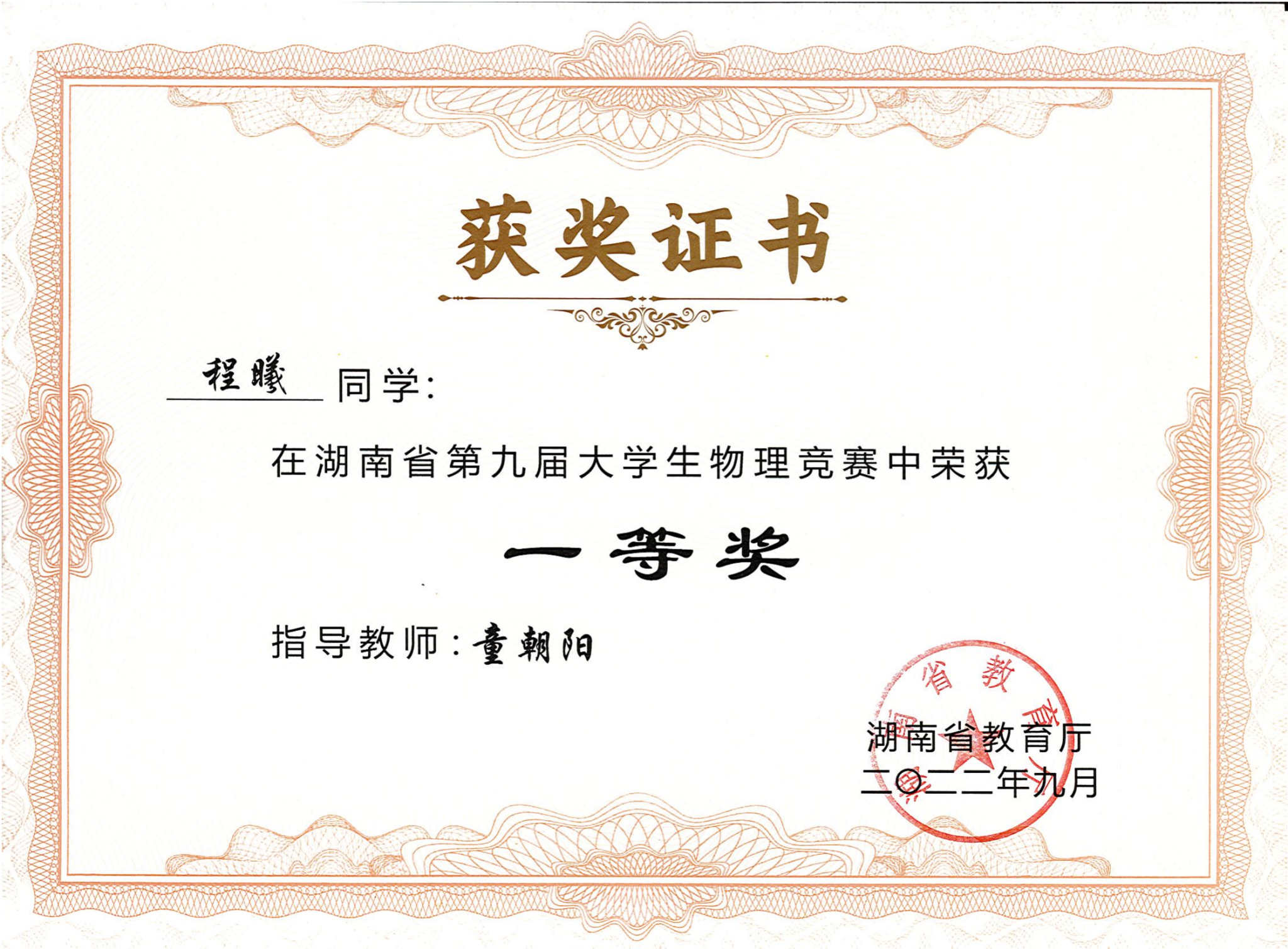 2022年湖南省第九届大学生物理竞赛获奖