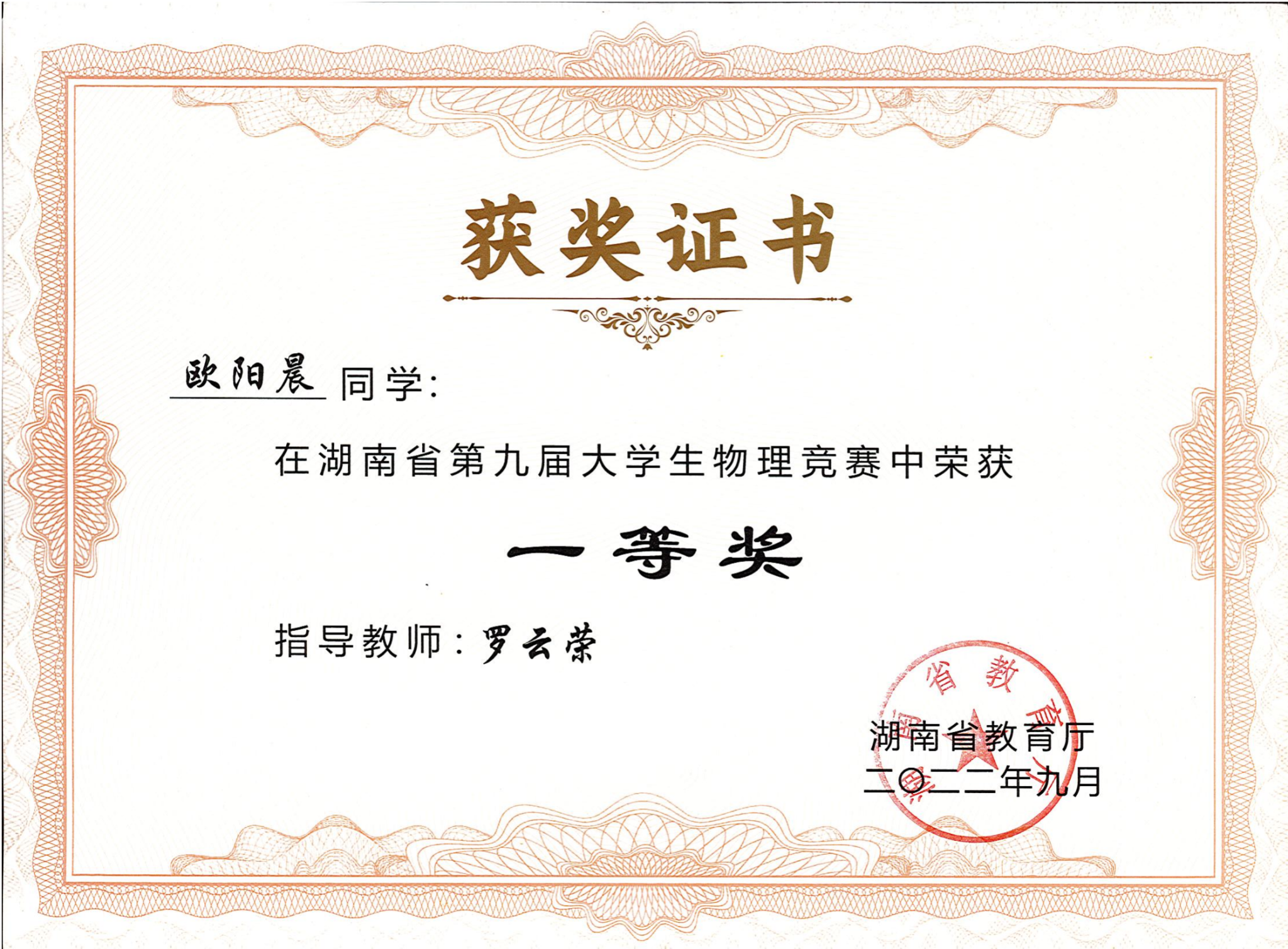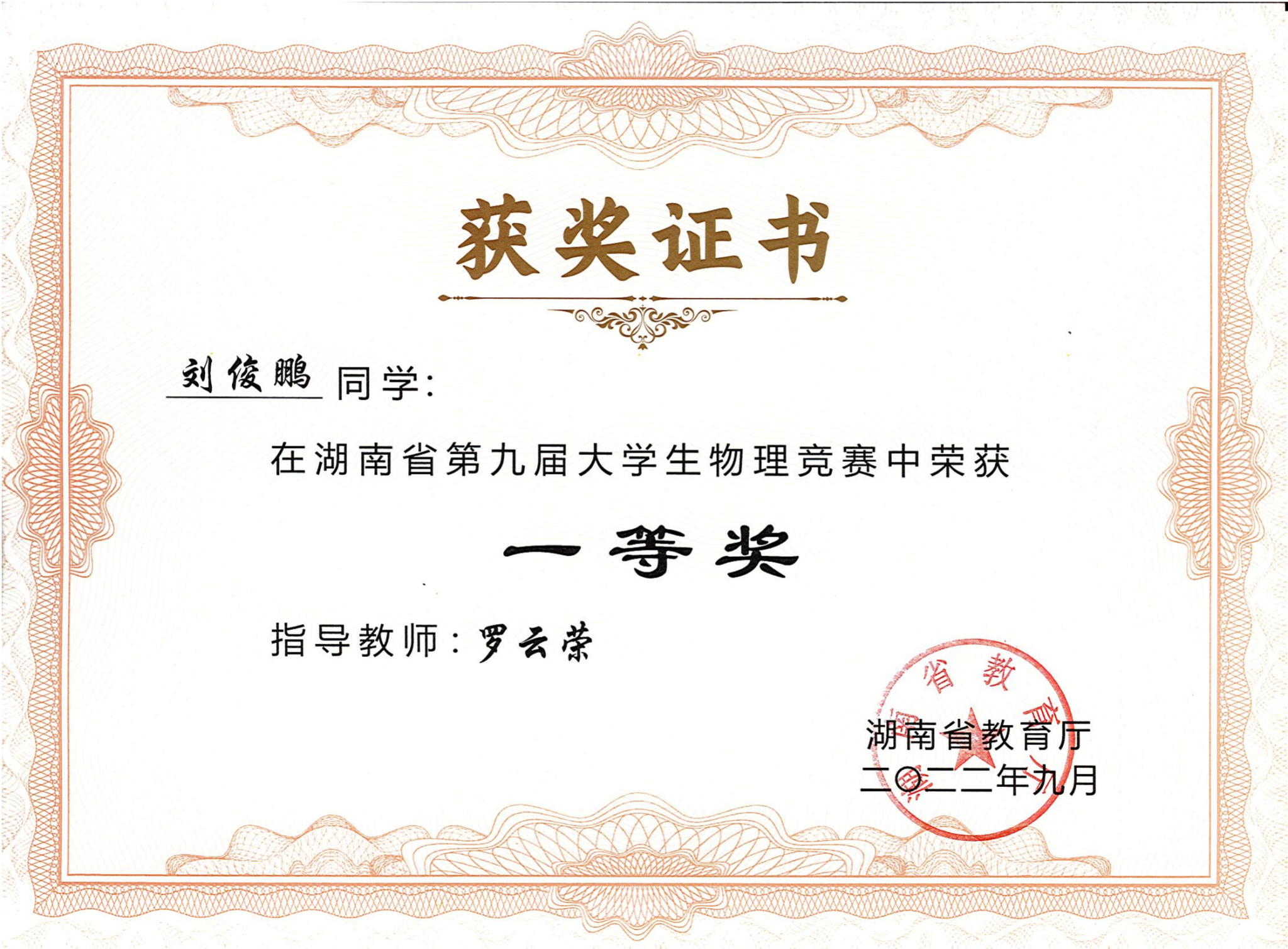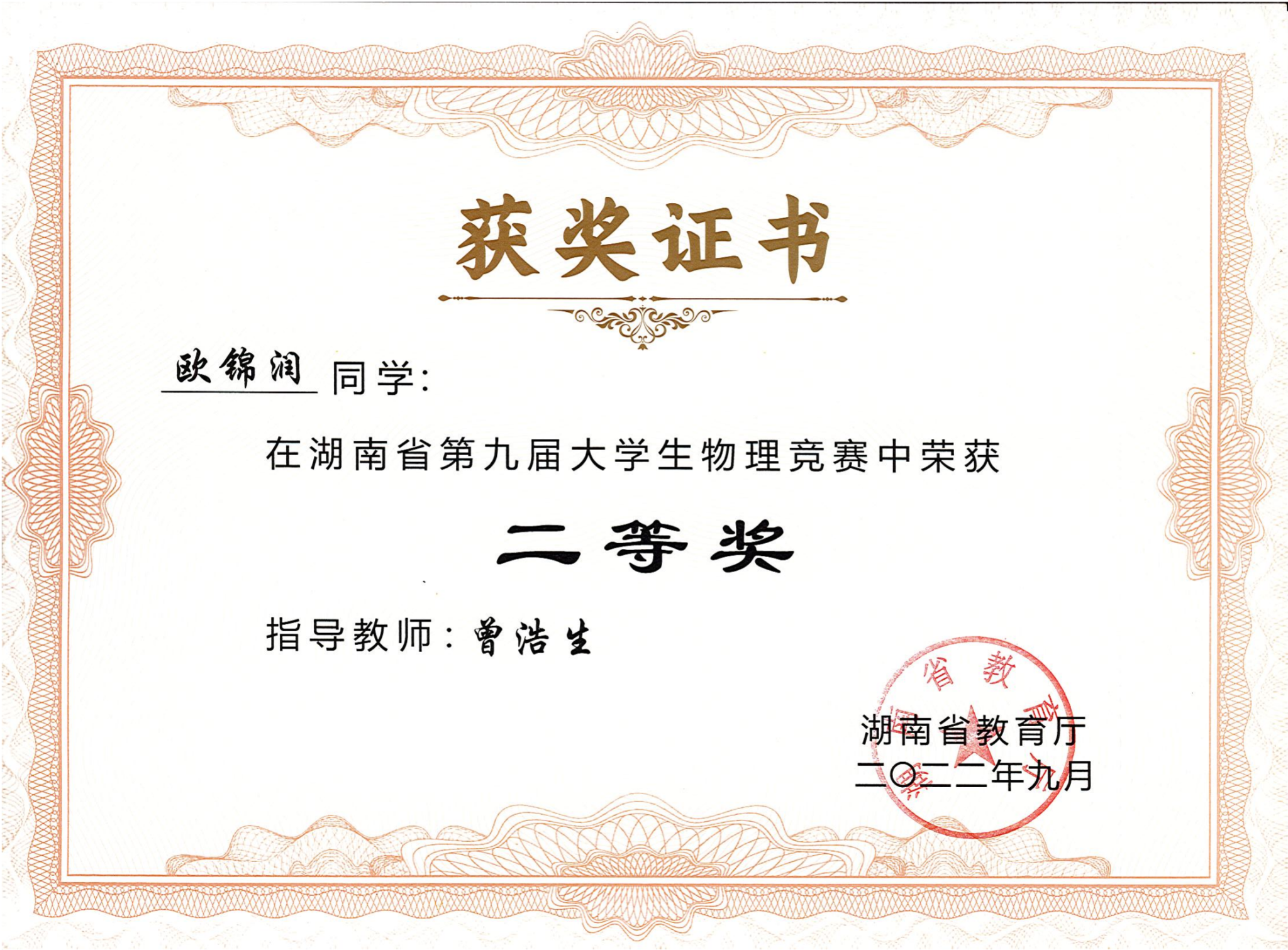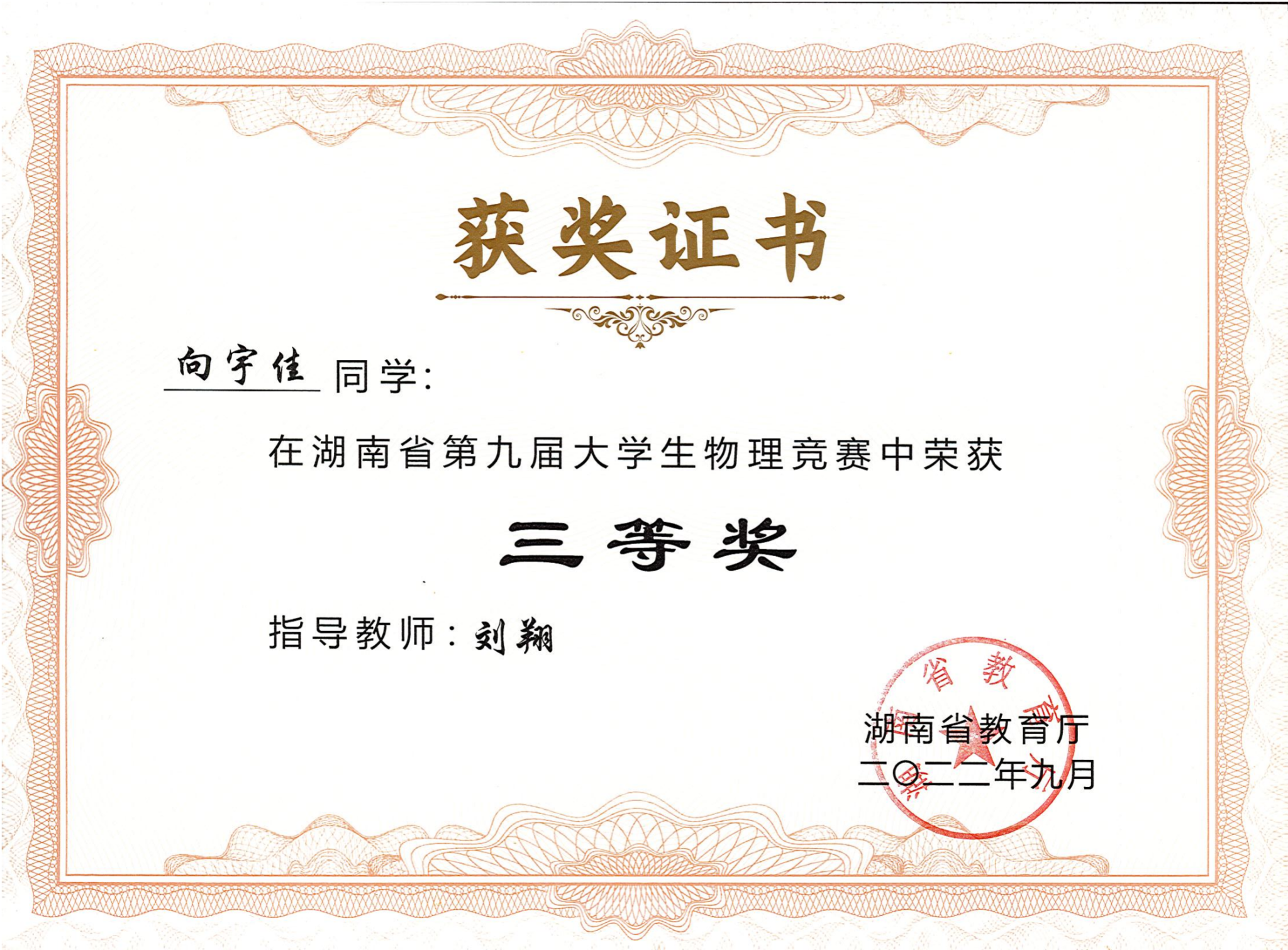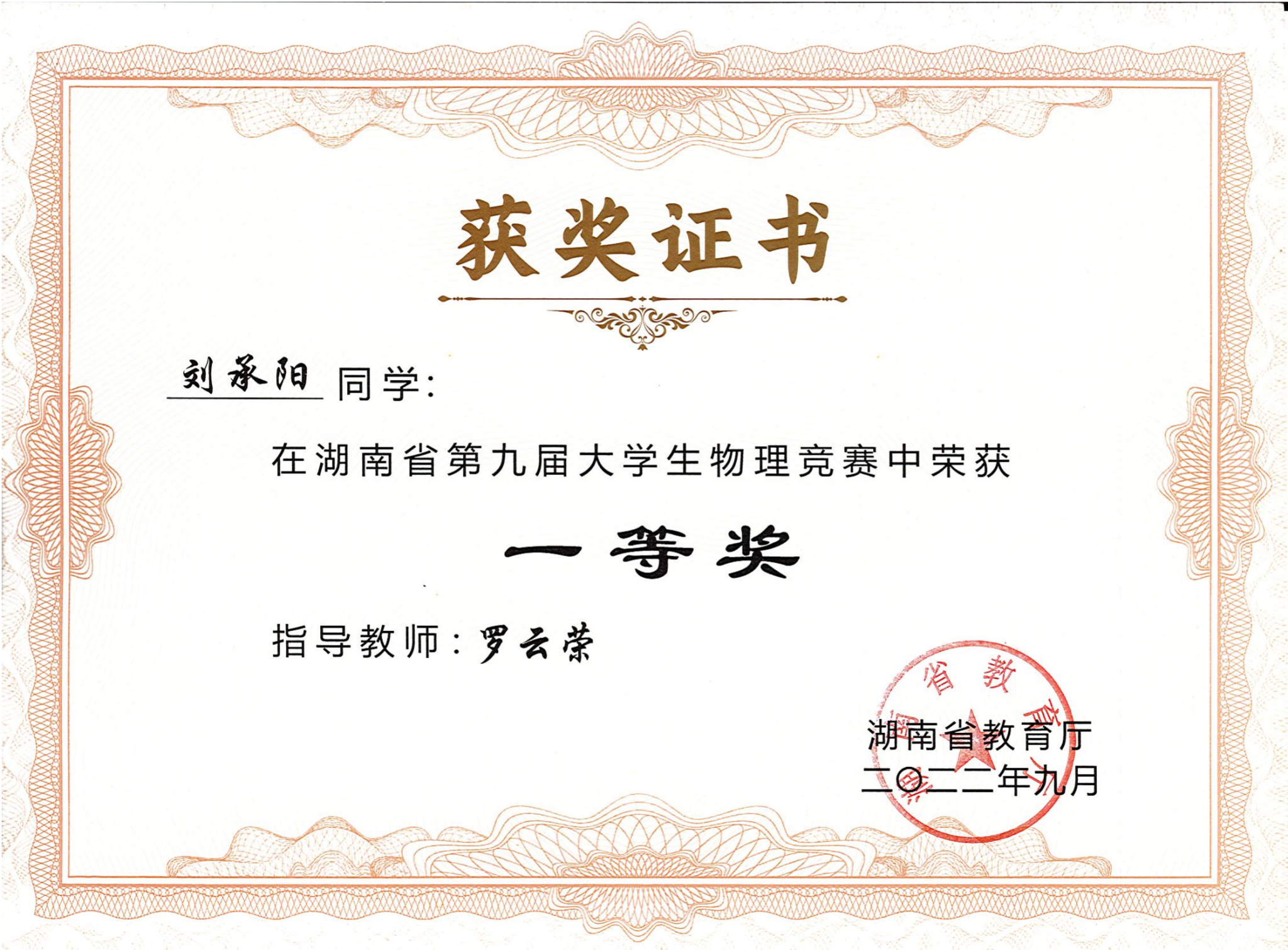 2022年湖南省第九届大学生物理竞赛获奖