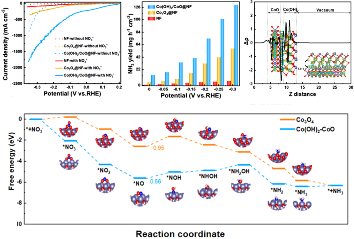 基于此,周海青教授团队成员通过浸渍-退火和原位电化学重构的策略制备了单金属Co(OH)2/CoO异质结构催化剂,在单金属氧化物异质界面处形成了强的内建电场。该催化剂在-0.2 V vs. RHE的低电位下实现了近1 A cm-2的工业级电流密度,同时达到了95.6%的NH3法拉第效率。理论计算结果表明,由内建电场诱导的CoO与Co(OH)2之间的非对称电荷分布,显著加速了硝酸根还原反应过程中的电子转移。此外,这种电荷分布还优化了Co活性位点对NOx-中间体的吸附能力,并有效降低了决速步骤(*NO→*NOH)的吉布斯自由能垒,从而大幅提升硝酸根还原反应动力学,最终实现了低电位下的高效制氨。这项工作为工业规模绿色氨生产的高效电催化剂设计提供了新思路。