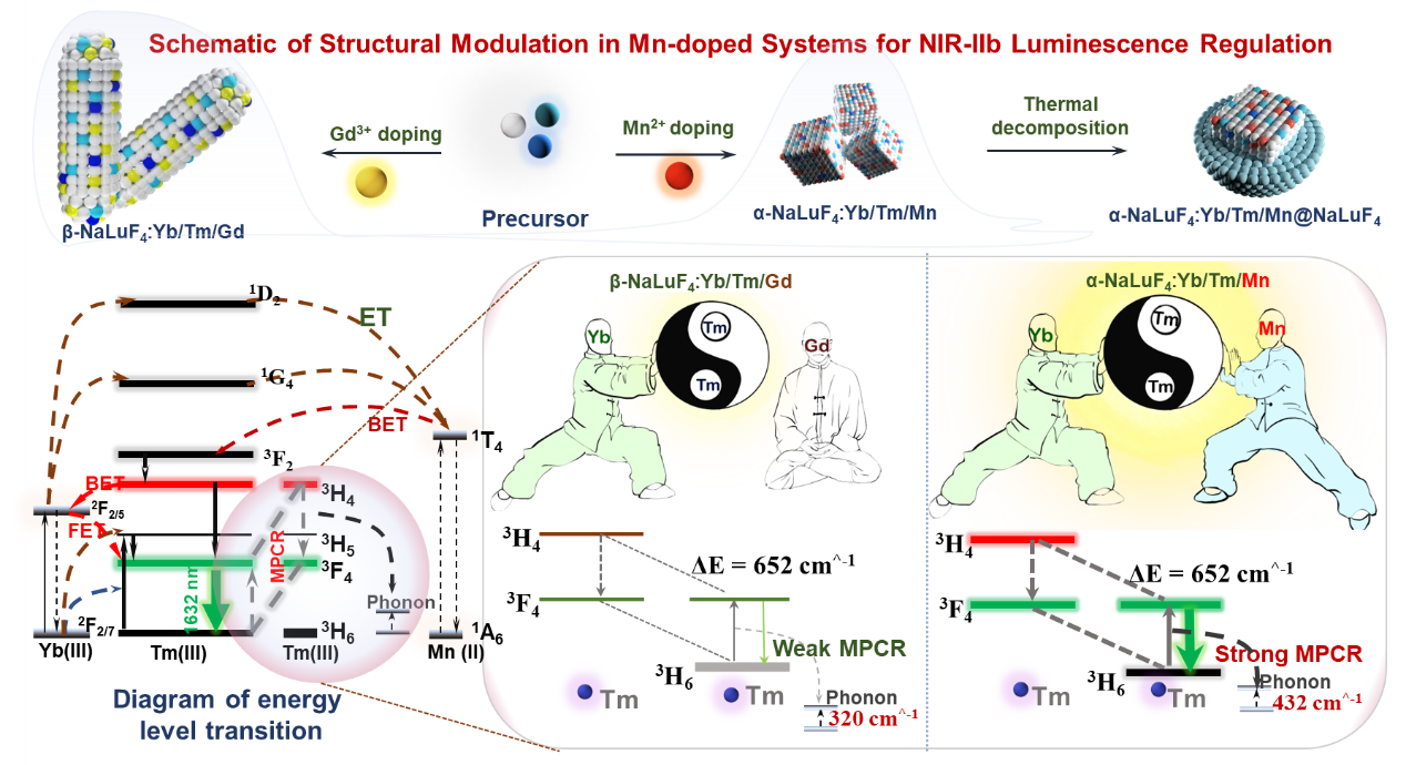 基于此,英国官方365上市物电院曾松军教授团队提出一种通用的锰离子(Mn²⁺)发光调控策略,成功解决了NIR-IIb纳米探针发光效率低的问题。以NaLnF4:Yb/Tm(Ln=Lu、Y、Yb)为基质,通过Mn²⁺掺杂实现三重调控:一是诱导晶体结构从六方相(β相)向立方相(α相)转变;二是调控声子能量提升能量交叉弛豫效率;三是构建Tm³⁺-Mn²⁺高效能量转移通路,显著增强多声子介导的交叉弛豫(MPCR)过程。经亲水性修饰后展现出卓越的生物成像性能,实现了高分辨血管、骨骼及肠道深组织光学成像。这一成果为设计用于深组织光学成像的高效NIR -IIb纳米探针提供了一种新的发光调控方法。