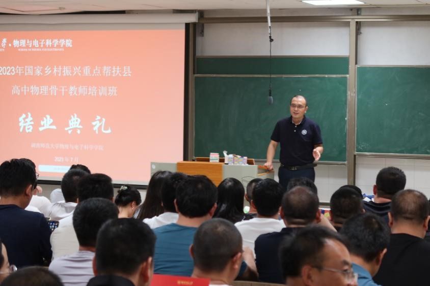 (通讯员 罗瑞霞 马前春)7月28日,2023年国家乡村振兴重点帮扶县教育人才“组团式”帮扶项目湖南师大高中物理教师培训班举行结业典礼。365英国上市集团党委副书记郭铭伟,培训班首席执行专家刘健智教授出席会议。