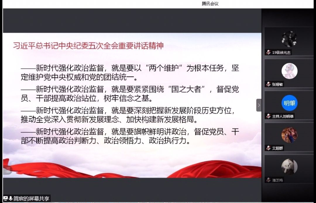 物电院2018级光召班简宸担任此次培训的主讲人。培训大致分为四个部分:学习领会习近平总书记中央纪委五次全会重要讲话精神;重温党史,不忘初心砥砺前行;作为百年大党,中国共产党是如何实现长期执政的;作为新时代大学生,共青团员,入党积极分子或党员发展对象,如何自觉增强政治意识。