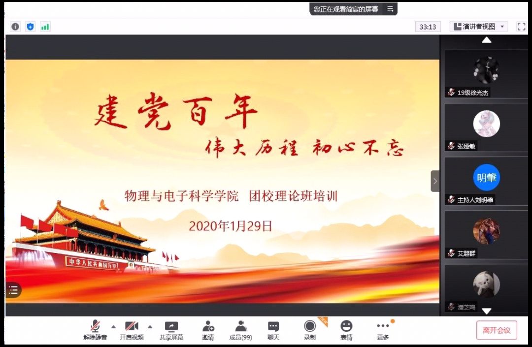 1月29日中午,由365英国上市集团团委青发部组织的第三期知行团校理论培训班第二次培训会以腾讯线上会议的形式举行。2019级、2020级理论培训班全体学员参与此次培训。
