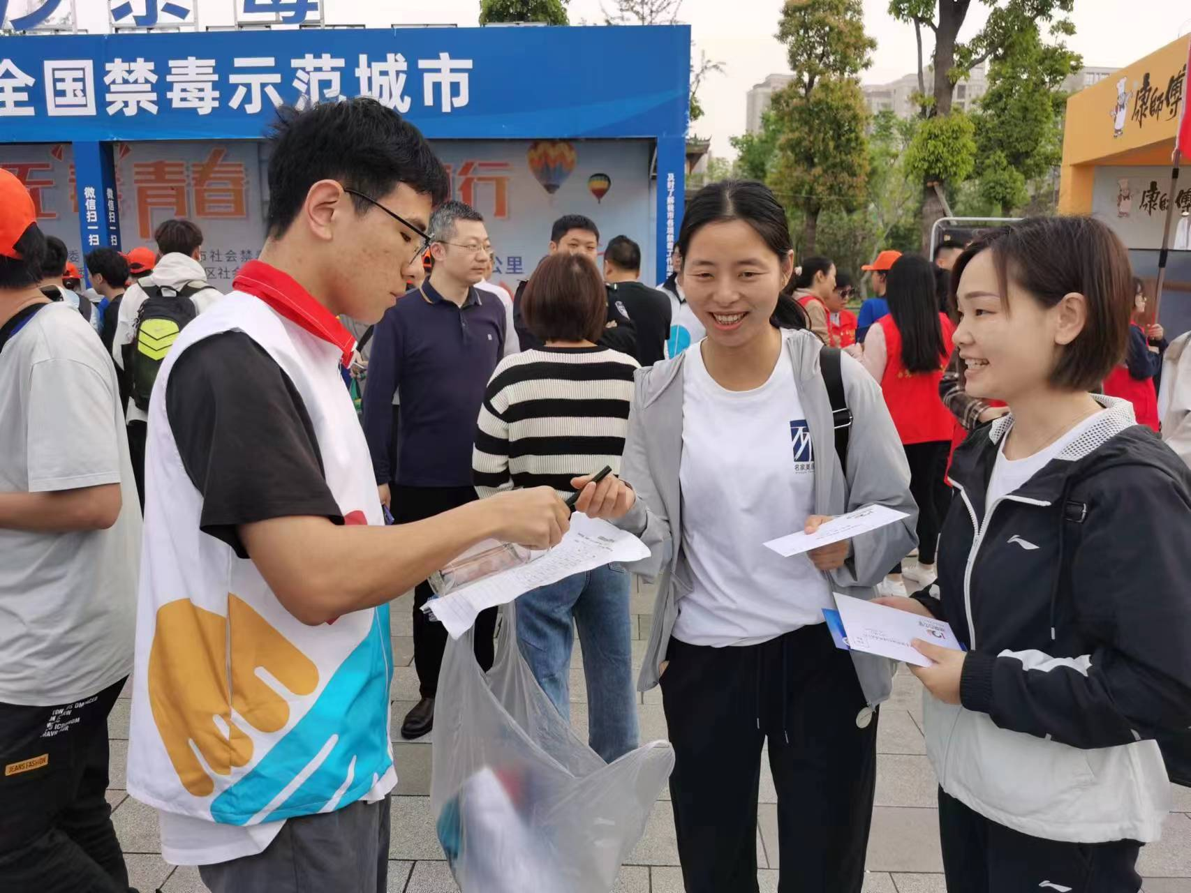 活动中,物电院志愿者对参加百公里毅行运动员以积极讲解禁毒知识,发放宣传资料等方式开展禁毒宣传,向参加活动的群众普及禁毒知识及相关的法律法规,禁毒展示台上,志愿者为前来参加活动的居民展示了各种有可能日常接触到的毒品,并通过体感互动游戏,潜移默化引导参加活动的居民和学生辨别和抵抗生活中的各种毒品诱惑。
