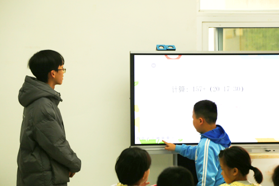 志愿者们带领小朋友们有序进行签到落座,并在随后的授课过程中协助主讲人维持现场秩序。粟畅通过PPT授课的方式教给小朋友们简便的运算方法和速算技巧,从而提高他们的速算能力。他与小朋友们多次互动,并不断鼓励小朋友们自主思考,积极回答问题。在他的鼓励下,小朋友们争先举手上台解题,分享自己的解题方法。此外,他还通过例题演示的方法加深小朋友们的理解,并通过习题训练的方式检验小朋友们对所学方法的掌握程度。