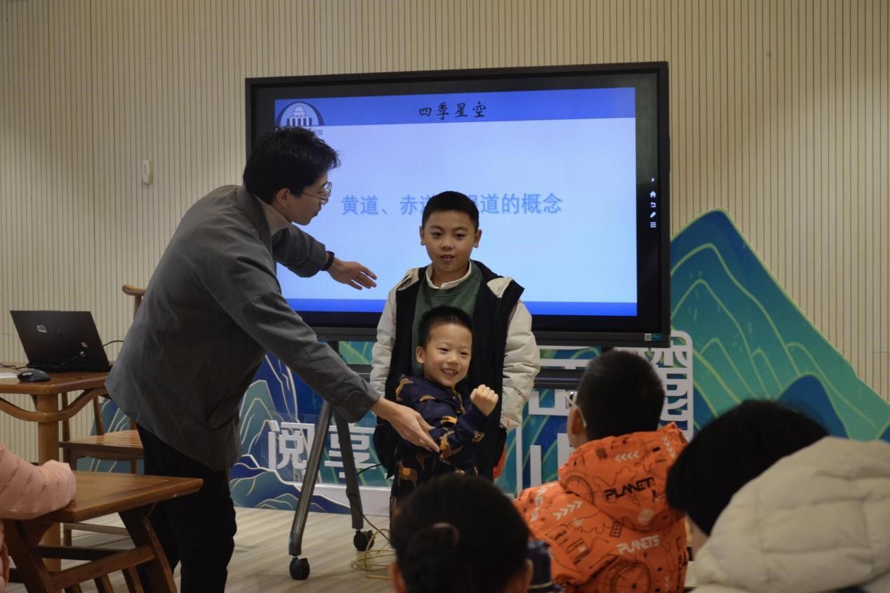 姚睿采取提问互动,用图文结合的形式深入为小朋友们讲解了四季星空的天文知识,并对星座、星空与星宿进行了基本介绍。姚睿带领现场小朋友进行扮演太阳和月亮的小游戏,形象展示了天体运动的特点,活跃了课堂氛围。同时,他通过操作“虚拟天文馆”程序直观地演示了星宿的方位和运动轨迹,帮助小朋友们更好的理解了行星运转原理。讲课结束后,现场小朋友纷纷表示意犹未尽,期待下一次的天文知识科普讲课。