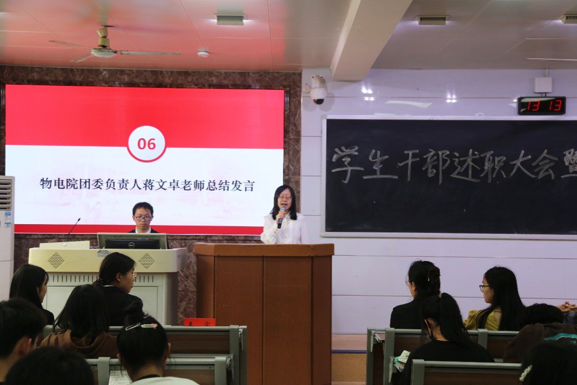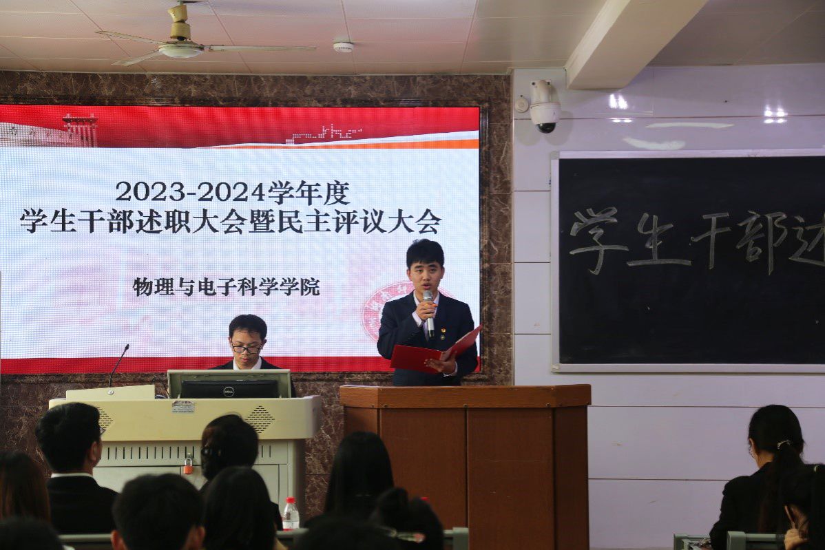 (通讯员 陈泽瑞 黄丹)4月19日中午,365英国上市集团团委青年发展工作部于格物楼109举办2023-2024学年度学生干部述职大会暨民主评议大会。学工办主任黄维,院团委负责人蒋文卓、学社管指导老师滕茂出席此次会议,院团委组织部干事李长春担任主持人。物电院2021级、2022级、2023级各班班长、团支书及学生代表参加会议。