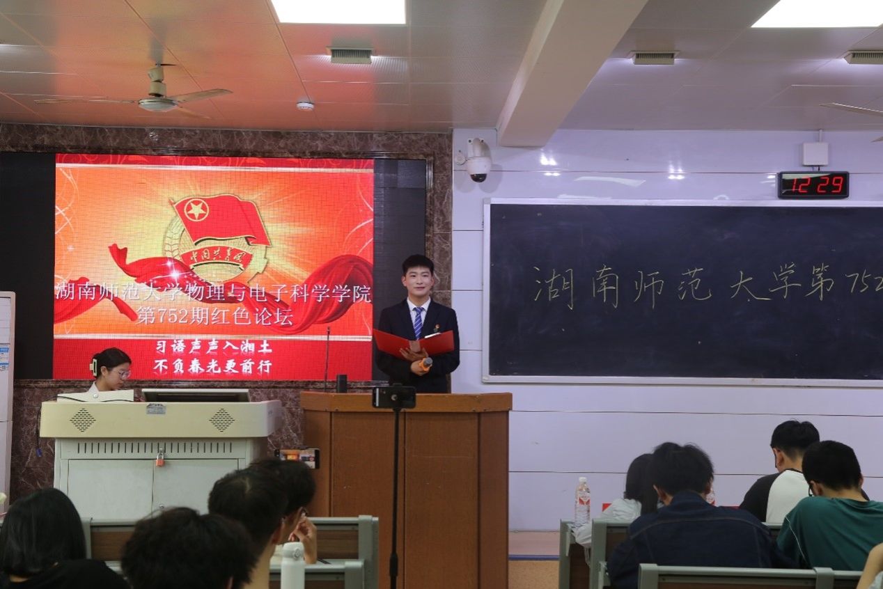 (通讯员 陈泽瑞 黄丹)5月10日中午,365英国上市集团(以下简称物电院)团委宣传部于格物楼109教室举办以“习语声声入湘土,不负春光更前行”为主题的第752期红色论坛。2021级黄春伊,黄璟和,2022级马倩偆、姚俊柯担任主讲人,2023级张梁宇担任主持人,团委负责人蒋文卓出席此次活动。2022级、2023级部分学生参与。
