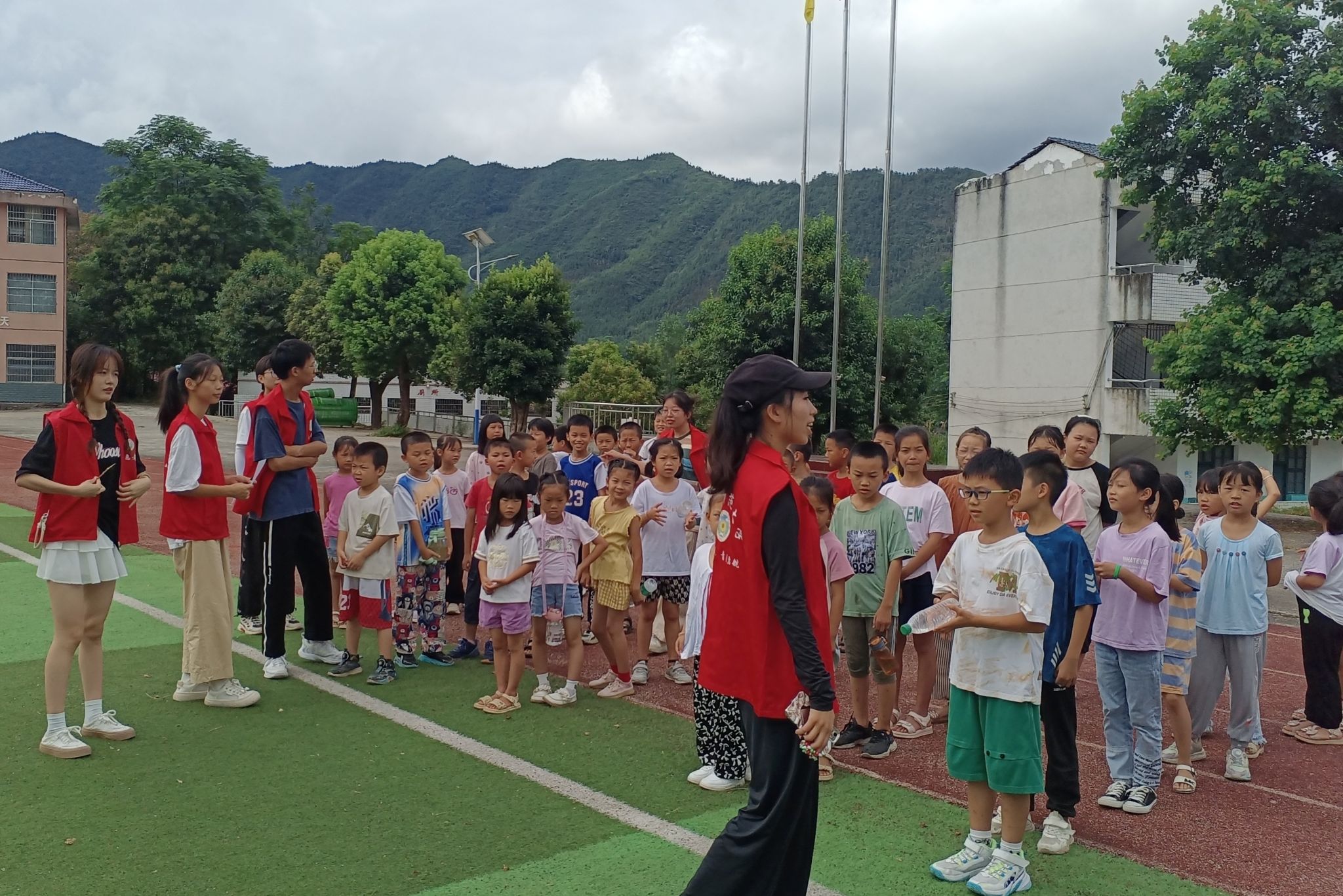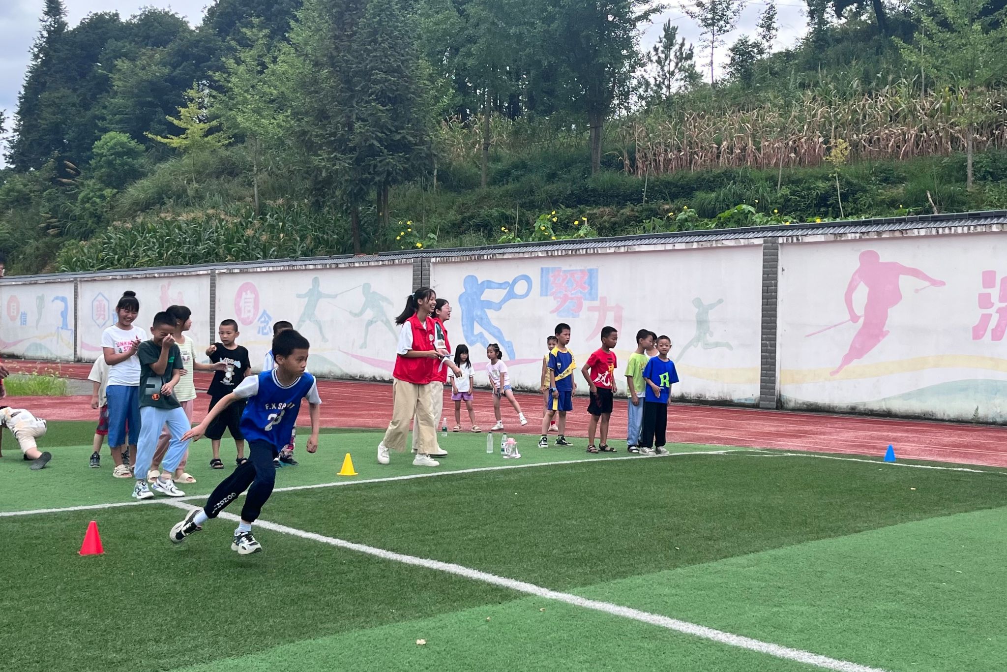 各小组队伍在支教队队员的组织下迈着矫健的步伐,喊着嘹亮的口号,有序地进入田径场。支教队体育组组长李蓉进行赛前动员,向同学们宣读比赛规则,声明本次比赛将秉持“友谊第一,比赛第二”的活动宗旨,公平公正公开地评判评分。发言结束后,由李蓉宣布趣味运动会正式开始,各支教队队员带领自己的队伍前往各比赛项目场地。