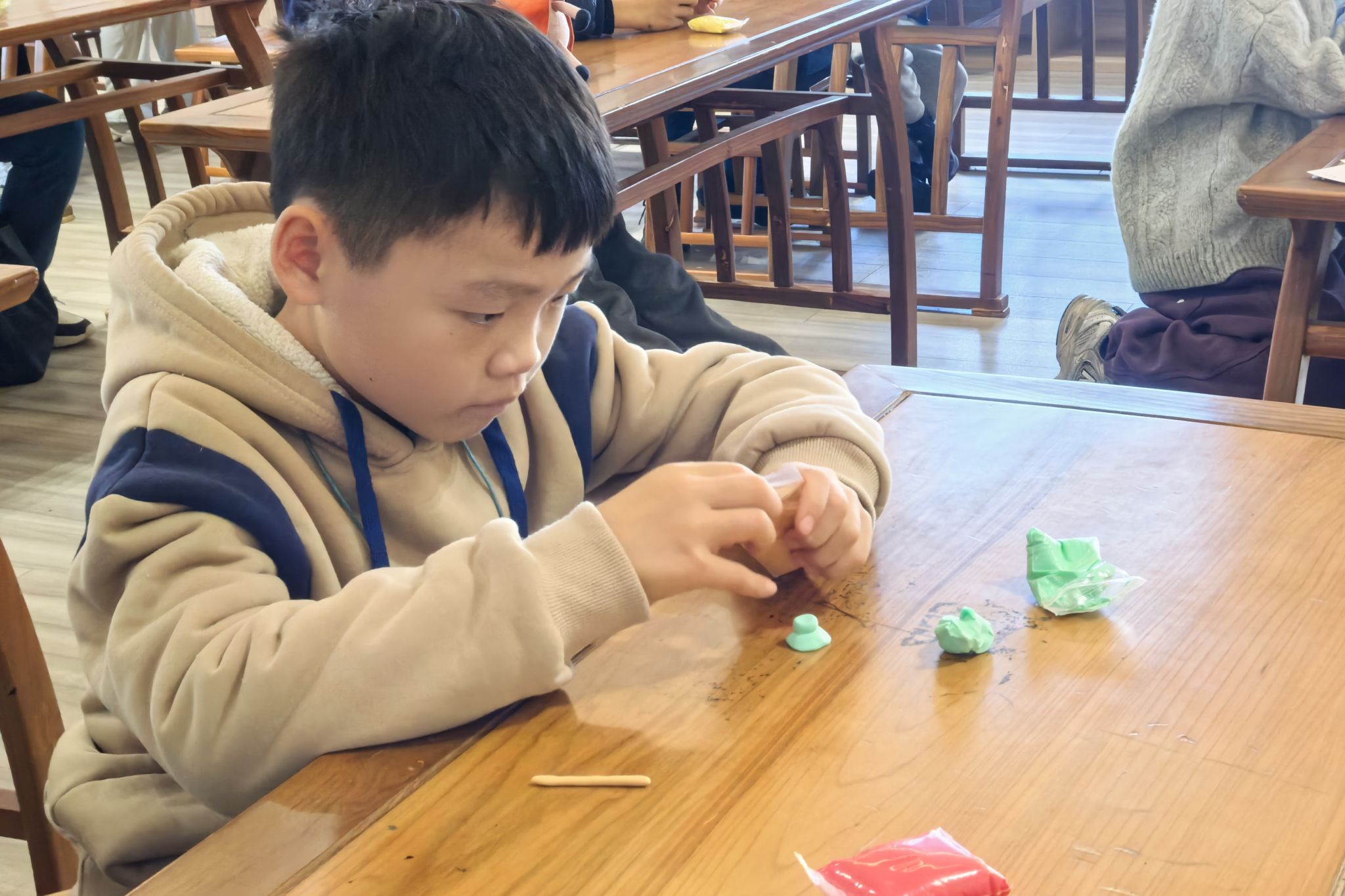 活动过程中,主讲人以图文并茂的形式为小朋友们讲述了《三气周瑜》的故事,通过提问、朗诵等方式让小朋友们在互动的乐趣中深刻理解诸葛亮、周瑜的性格特征和人物形象。实践环节中,志愿者为小朋友们分发橡皮泥并引导他们根据主讲人所讲述的《三国演义》故事内容用橡皮泥制作人物或者武器。创作完成后,小朋友们纷纷展示着亲手用橡皮泥制作的人物形象或武器,互相分享自己对个人作品的看法。