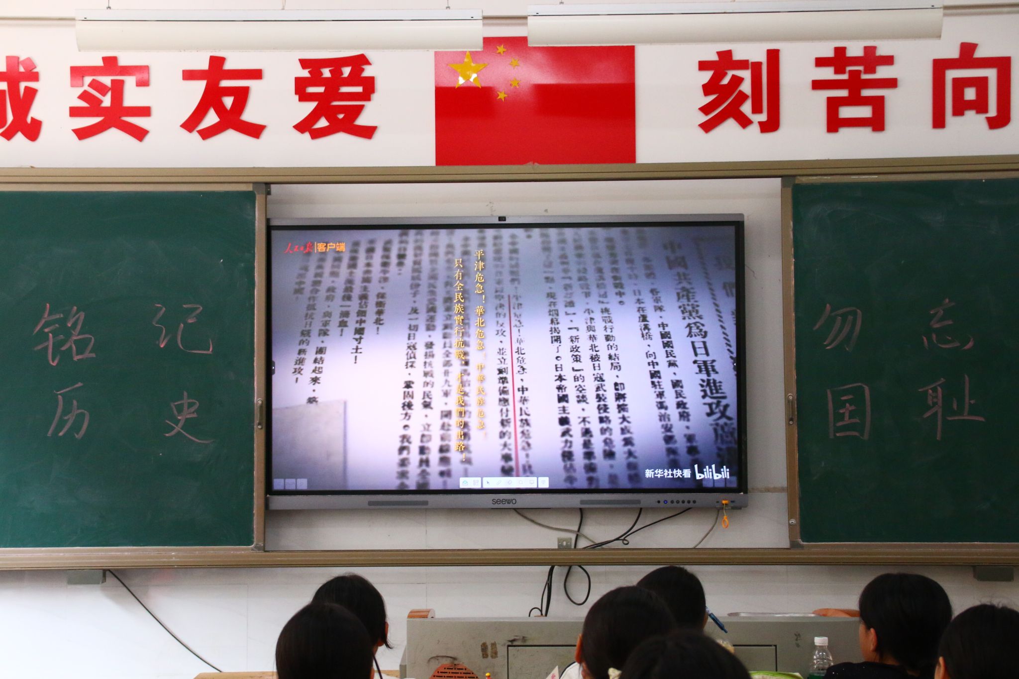 主题班会课上,同学们手握五星红旗,专注地观看叙述卢沟桥事变经过的短片以及各种珍贵史料照片。惨痛的的史实让教室内氛围沉重。观看结束后,同学们纷纷表示对日本侵华活动感到屈辱与愤慨,感慨如今的和平生活来之不易,认识到要做到勿忘国耻,为国争光。最后,主讲人鼓励同学们要努力学习,报效祖国。
