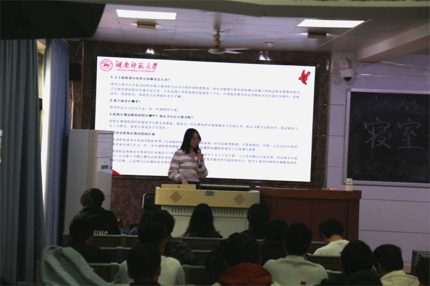 大会伊始,贺巧珍宣读文明宿舍评比管理办法,从卫生、安全、纪律三个关键维度明确管理要求,强调通过标准化管理提升寝室整体环境质量。朱江美结合新生适应期特点,对寝室长与生活委员的工作提出期望,鼓励大家发挥桥梁作用,及时反馈同学需求,凝聚寝室向心力。健康服务部陈翔则就日常管理工作进行了具体布置,明确了每周教室卫生打扫与双周四寝室校级检查的常态化安排,引导学生重视寝室文明建设。在答疑环节,会议针对请假流程、工具领取、检查结果异议反馈等高频问题进行了集中解答,确保了各项管理规章清晰透明、顺利执行。