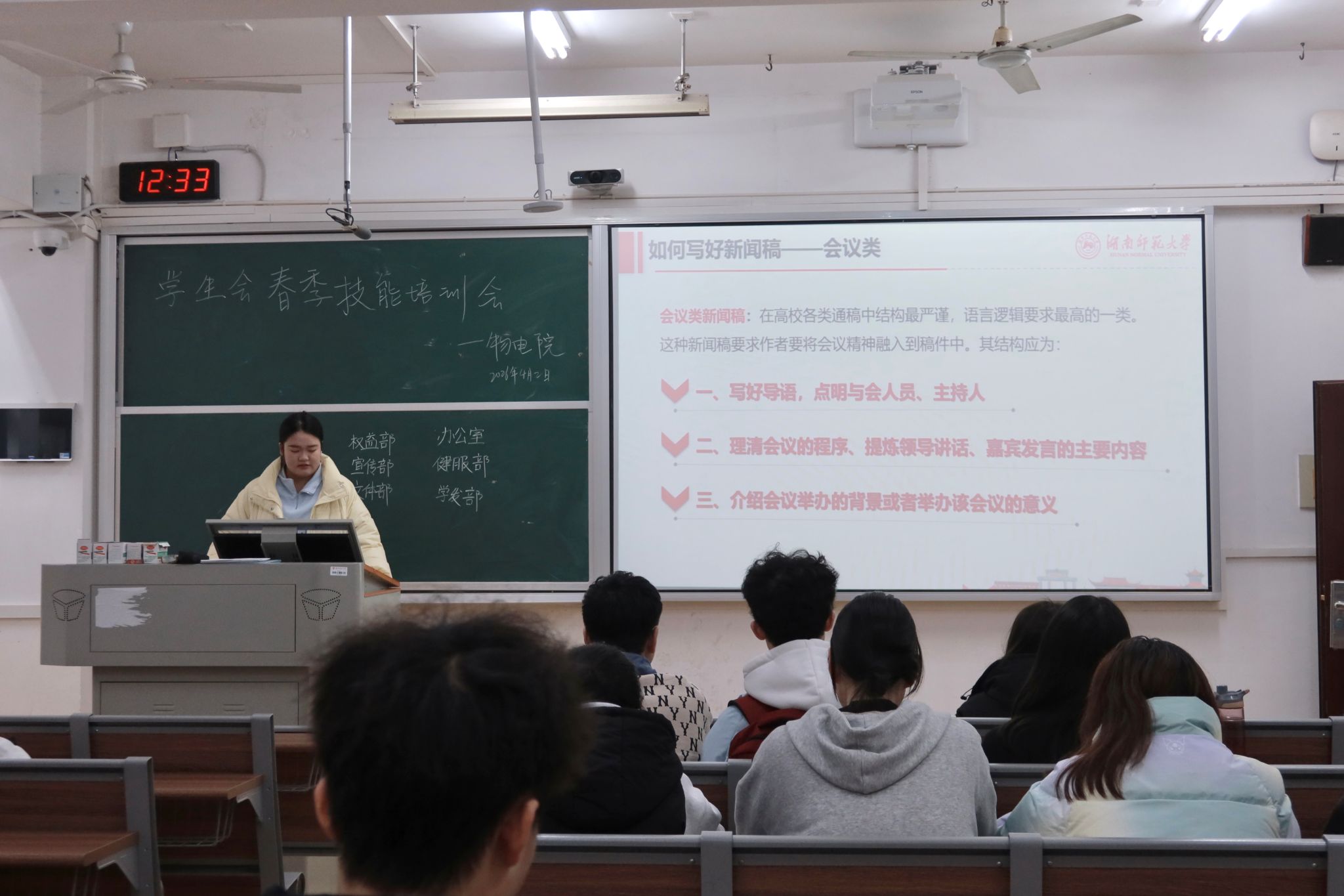培训中,黄檬讲解了校园新闻稿件编写的基础与技巧,分别按会议、活动、竞赛等类别梳理稿件结构,讲解了各类新闻稿的写作要点与注意事项,并展示了新闻稿结尾的多种写法、发文规范及图片拍摄与排版的相关要求,对写作中的常见问题进行解答。