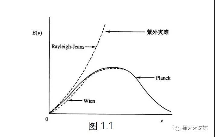 可以看到Rayleigh与Jeans的理论s 的理论中𝐸𝜈一个与𝜈2成正成正比,这显然会导致一个荒谬的结论:虽然在低频段与实验曲线还算可以拟合上,然而随着电磁波频率等升高,黑体辐射的能量将以正比于其频率的二次方的形式升高,这会导致该理论在波长较短的区域即紫外区域表现为发散形式,这在历史上被称为紫外灾难。