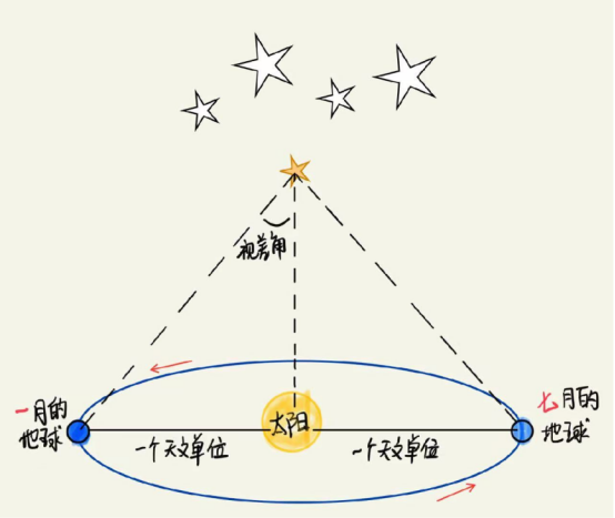 测量方法:1.在1月日落和7月日出时测出目标星俯视角的余角;2.利用数学几何计算视差角;3.三角函数知识计算恒星与地球的距离。