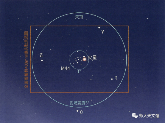6月2日11:30,蜂巢星团在火星以南0.1°,此时火星亮度1.6等,虽然不是火星最亮的时候,但M44中的恒星全部暗于6等,对比之下,火星比星团中的恒星要亮得多。天黑后大约有1个小时的时间可以观测。