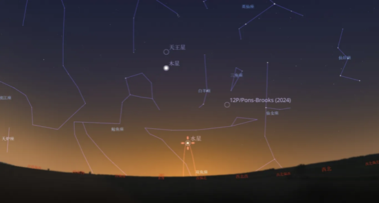 2024年3月下旬,在黎明东南偏东的低空,金星和土星看起来很接近。3月22日10时金星合土星(视赤经22h57m51s),地心所见土星在金星以南0.35度的地方。2颗行星进入100倍左右的天文望远镜的同一视野内。但是,日出30分钟前的高度非常低,约为2度,实际上用望远镜看起来很难。请在东南偏东的天空开阔、无遮挡的地方,用双筒望远镜观察接近的情况吧。金星很明亮,用肉眼很容易看到,但土星得用双筒望远镜才能找到吧。