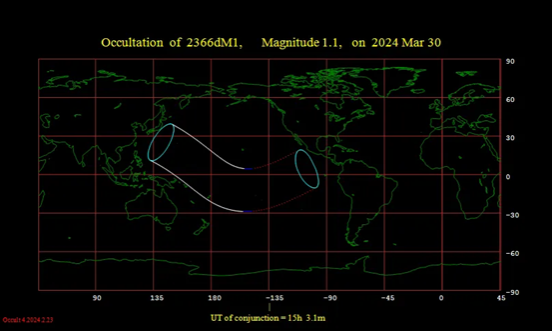 2024年3月30日23:03心宿二合月(视赤经16h30m54s),地心所见心宿二在月球以南仅0.26度,如此近的距离,太平洋地区可见月掩心宿二。