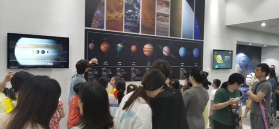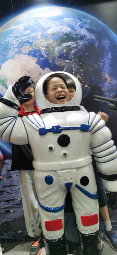 此外,场馆还设置一个宇航员拍照打卡区。头凑至玻璃钢宇航员头盔处,以月球表面回望地球为背景,“咔擦”一张照片,留下了孩童们开心满足的容颜,激发了孩子们对探索宇宙,投身国家航天事业的热情和动力!