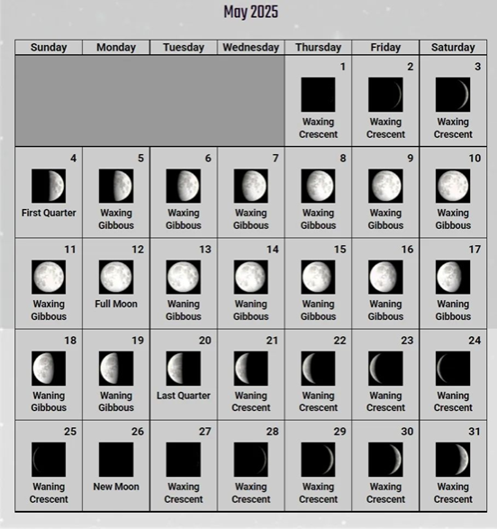 5月24日06:15是年度最大残月(36万2849.76km),07:51金星合月(视赤经1h06m58s),地心所见金星在月球以南3.99度的地方。
