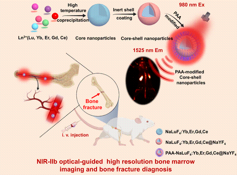 基于此,曾松军教授课题组设计了一种具有优异NIR-IIb发射的NaLuF4:Yb/Er/Gd/Ce@NaYF4核壳纳米探针,利用该探针,首次实现了NIR-IIb光学引导的小鼠活体骨骼及骨髓的高分辨光学成像,系统揭示了该探针在骨髓中的代谢机制,并进一步实现了NIR-IIb光学引导的小鼠骨折疾病的高灵敏性光学诊断。该研究为设计新型NIR-IIb光学探针实现骨髓及骨骼的高分辨光学显影和骨骼相关疾病的高灵敏光学诊断提供了新的策略和方法。