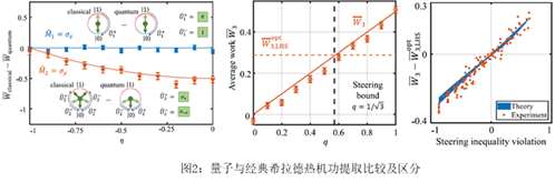 在本工作中,研究人员构建了一个量子版本的希拉德热机模型,工作介质是一个量子比特。妖精并非直接测量工作介质的量子态,而是通过测量与工作介质存在关联的环境量子比特,获取工作介质的信息,并实现功提取。通过研究工作介质系统与环境之间的关联,我们发现量子导引——一种非对称的量子关联——与热机做功的大小有密切的关系。量子导引是由埃尔温·薛定谔于1935年最先提出的基础量子关联概念之一。当妖精可以“导引”工作介质时,希拉德热机可以提取更多的功。存在量子导引的希拉德热机(量子)与不存在量子导引的希拉德热机(经典)可以通过一个优化的导引不等式有效区分,该不等式由工作介质上不同功提取方式的平均功表示。研究结果表明,量子导引不等式破坏越大,量子希拉德热机的功提取不等式破坏(用于衡量做功超越经典极限的大小)就越大,也就更加体现出量子优越性。研究人员基于金刚石氮-空位色心体系实验实现了上述量子希拉德热机。本工作以希拉德热机为例,展示了量子热机中量子关联的独特作用,为建立量子信息和量子热力学的桥梁提供了新的思路。