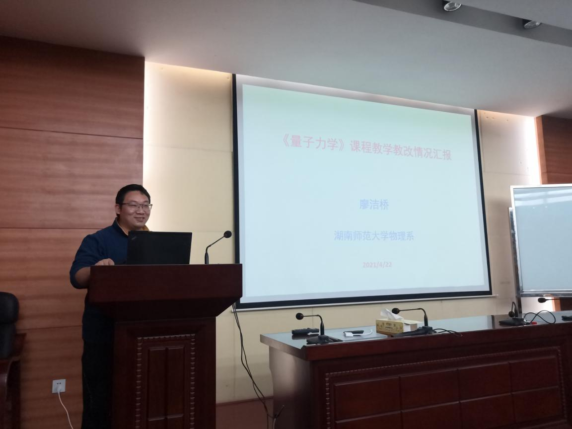 廖洁桥教授汇报了《量子力学》课程的教学教改情况,包括量子物理教学团队获得的教学教改项目、为上好《量子力学》课程所做的准备、《量子力学》课程与先遣课程的衔接、光召班《量子力学II》课程教学内容的安排、《量子力学》课程中思政元素的挖掘、教学教改论文的梳理和教材建设的规划,全面而细致地展示了量子物理教学团队教学教改的最新进展。