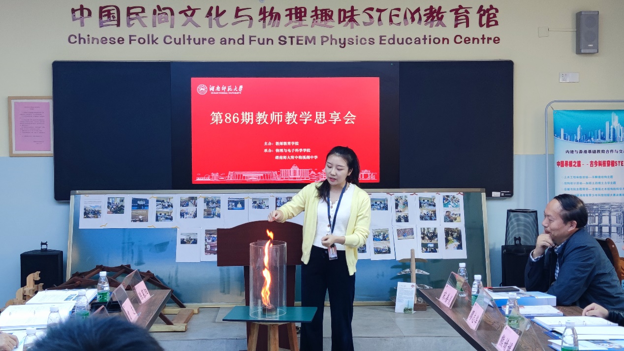 李湘黔以“中国民间文化与物理趣味STEM教育课程体系建设与思考”为主题,分享了自己教学工作的心得体会,以其主讲课程《中国民间文化与物理趣味STEM教育》为例,介绍湖南师大附中梅西湖中学STEM教育校本课程建设,教学团队打造,实验项目设计所付出的艰辛和努力。作为湖南省青少年STEM教育科普基地负责人,他邀请英国官方365上市物理师范专业本科实习生彭慧同学为大家展示了火焰龙卷风实验现象并阐述了其背后的物理原理与规律;亲自上阵为大家揭示了空竹蝉鸣的物理玄机;分享STEM教育项目设计的经验;以其亲身经历对比中西方文化教育差异提出独立见解与思考。