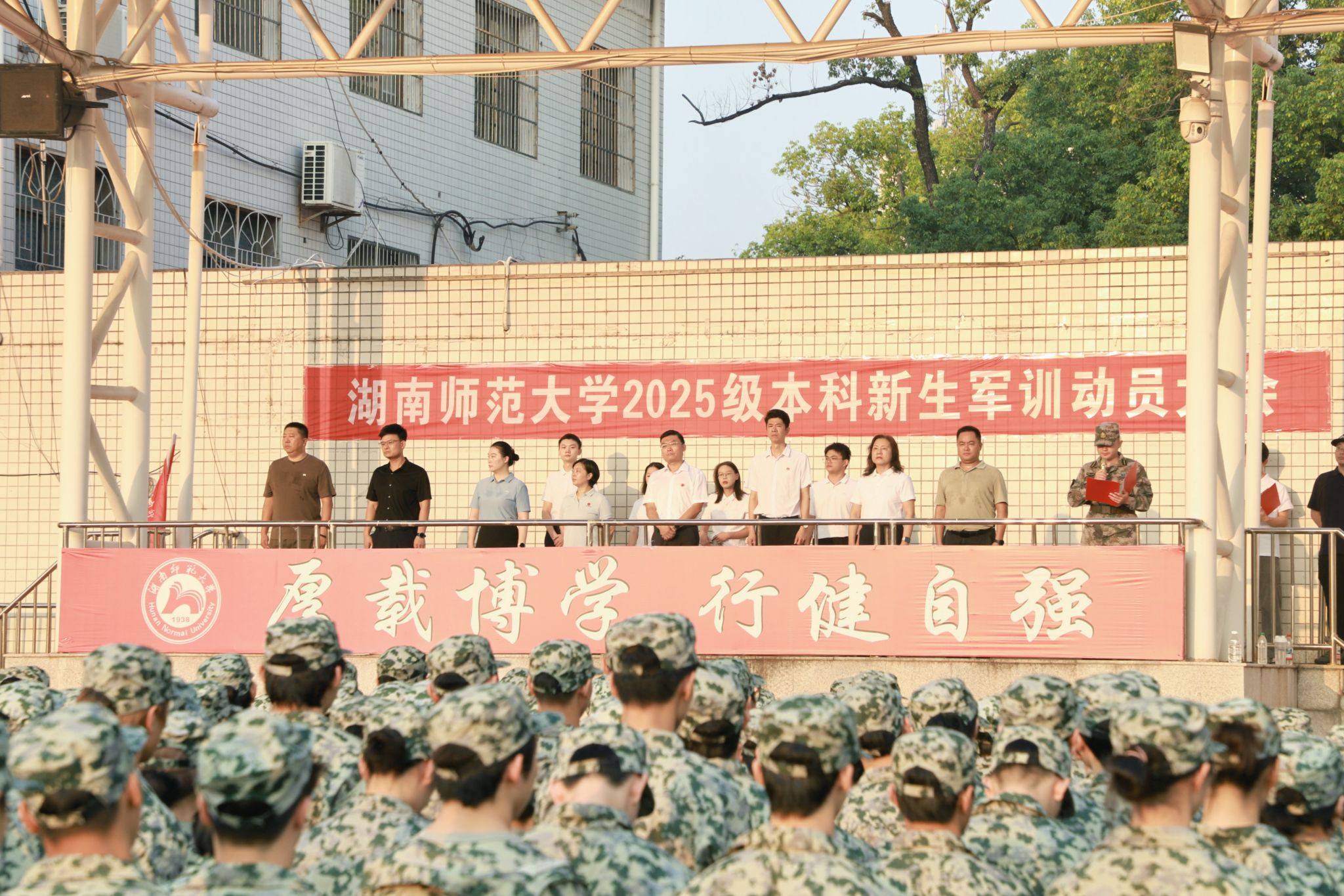 体育学院2025级新生旷子豪作为新生代表在国旗下发言,他指出军训的严格与艰辛和其在精神与物理意义上的双重重要性,并代表全体新生郑重承诺将刻苦训练,磨炼意志,以饱满的激情,昂扬的热情投入到军训中。