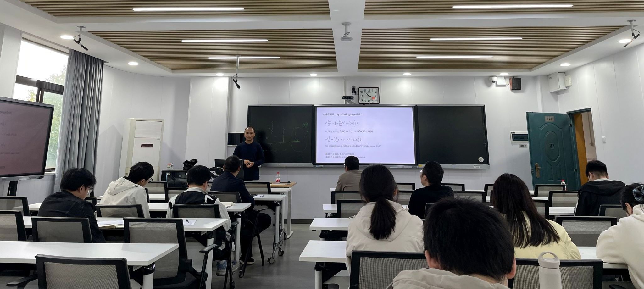 辜琦老师以“冷原子分子中的新物态”为题,回顾了冷原子30年来的发展历程。他首先介绍了冷原子体系的特点、冷原子在验证经典理论和模拟传统体系等方面取得的巨大成功,然后深入探讨了如何利用合成规范场和精细调节相互作用等方法创造全新的体系和物态。他还向在座师生分享了自己近期的科研工作,最后展望了冷分子气体和原子阵列等新发展方向。辜琦老师报告内容详实,逻辑清晰,具有较强的理论指导性和学术价值。