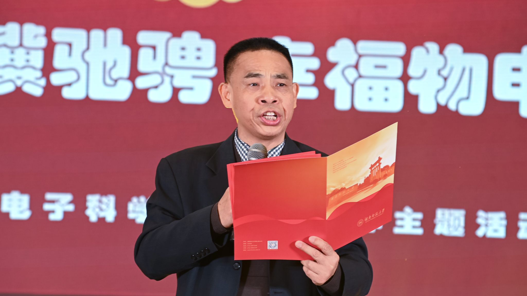 湖南三书礼文化发展有限公司总经理苏文华校友也带来了真挚的分享。他感慨道,是物电学院的培养为自己的创业之路奠定了坚实基础,多年来始终感恩母校的教诲与关怀。他对学院给予的信任与支持表示感谢,期待未来能与学院在更多领域深化校企合作,实现互利共赢,并送上新春祝福。