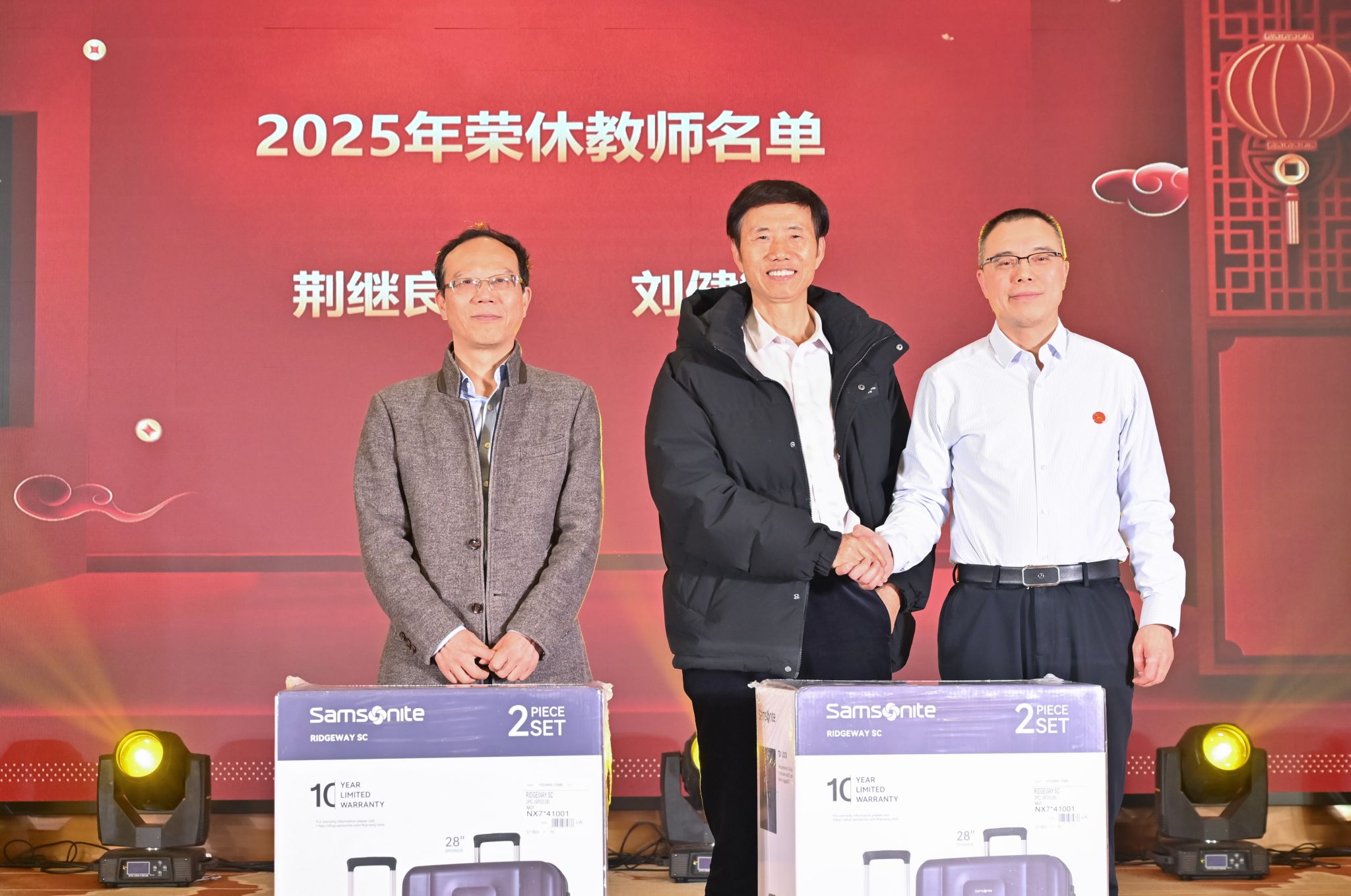 联欢会由周新星、翟亚新老师主持,在庄重温馨的教师荣休仪式中正式拉开帷幕。“三尺讲台育桃李,一生坚守铸师魂”,主持人深情致辞,致敬深耕教坛、默默奉献的荣休教师。荆继良教授、刘健智教授上台接受全体师生的敬意与祝福,他们用岁月与智慧照亮了无数学生的成长之路,现场掌声雷动,满含不舍与崇敬之情。