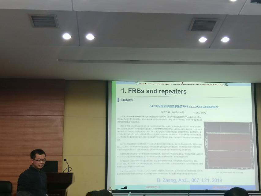 12月3日下午4点,由北京师范大学天文系李正祥副教授主讲的题为“快速射电暴:强有力的宇宙学和天体物理探针”的学术报告在量子楼410报告厅举行。报告由物电院王梦杰老师主持。
